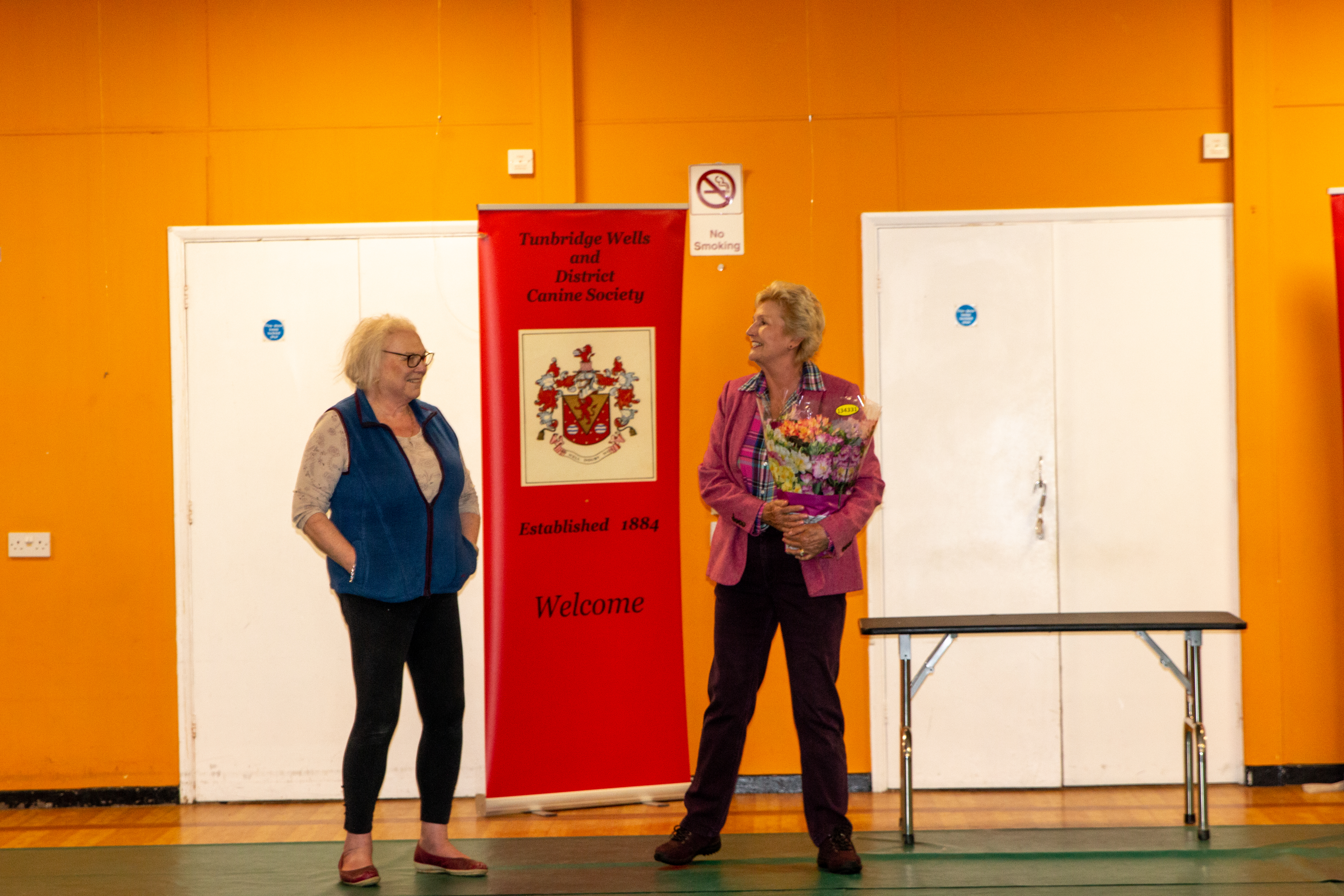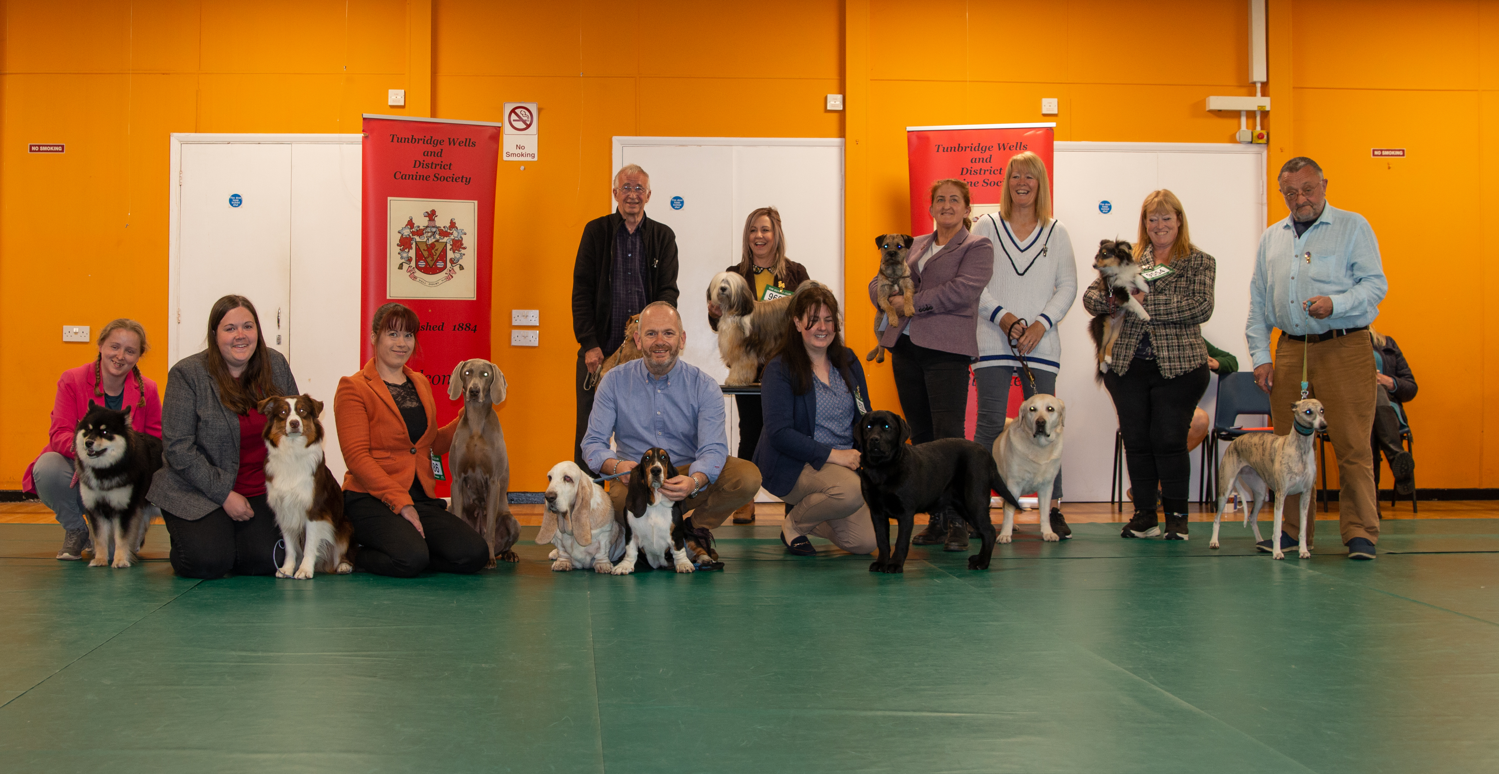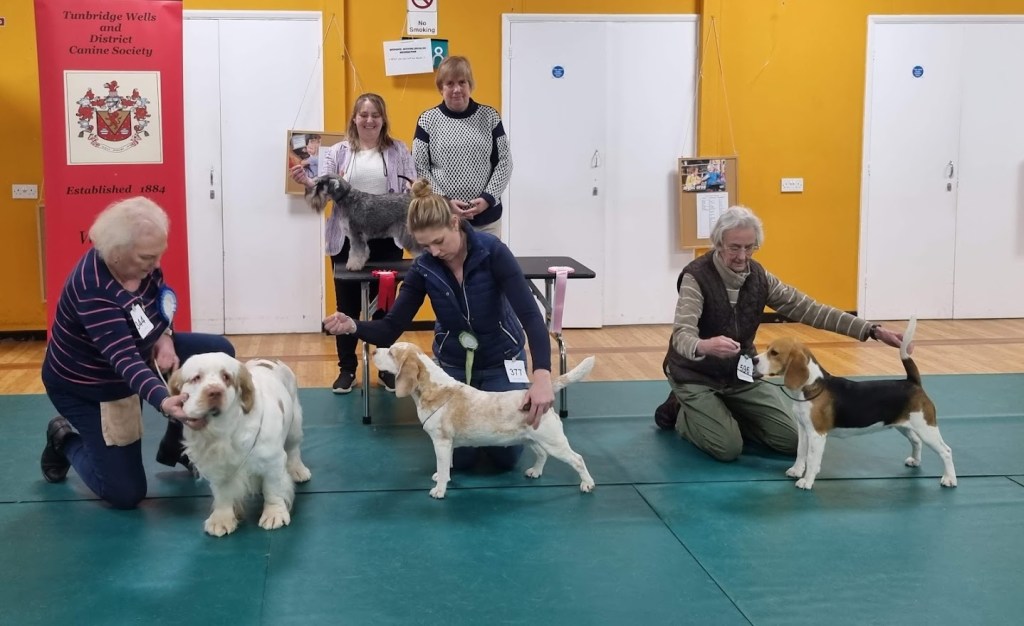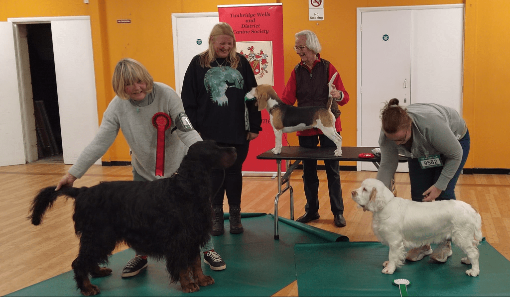 The last Tuesday evening in May saw selected team members from TWDCS Ringcraft facing off against the team from Eastbourne & District Canine Society. Inter-Club matches used to be held between the two clubs (and others) historically but it isn’t something that has been done in some years. As such it was absolutely lovely for us to be able to welcome the team from E&DCS to our venue in Five Oak Green for the first round of the competition. Both clubs fielded teams selected from their ringcraft groups and as per normal match rules, no CC winners were allowed. The teams for each side thus consisted of 4 Puppies, 6 Adults and 2 Veterans each who then faced off in pairs knock out style. Our judge for the evening was Trish Goodyear and we would like to thank her very much for taking the time out of her evening and lending us her experience!